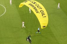 Activistul Greenpeace a fost aproape să se prăbușească în tribunele stadionului din Munchen, marți, la meciul câștigat de selecționata Franței în fața Germaniei, dar acesta a aterizat pe gazon.