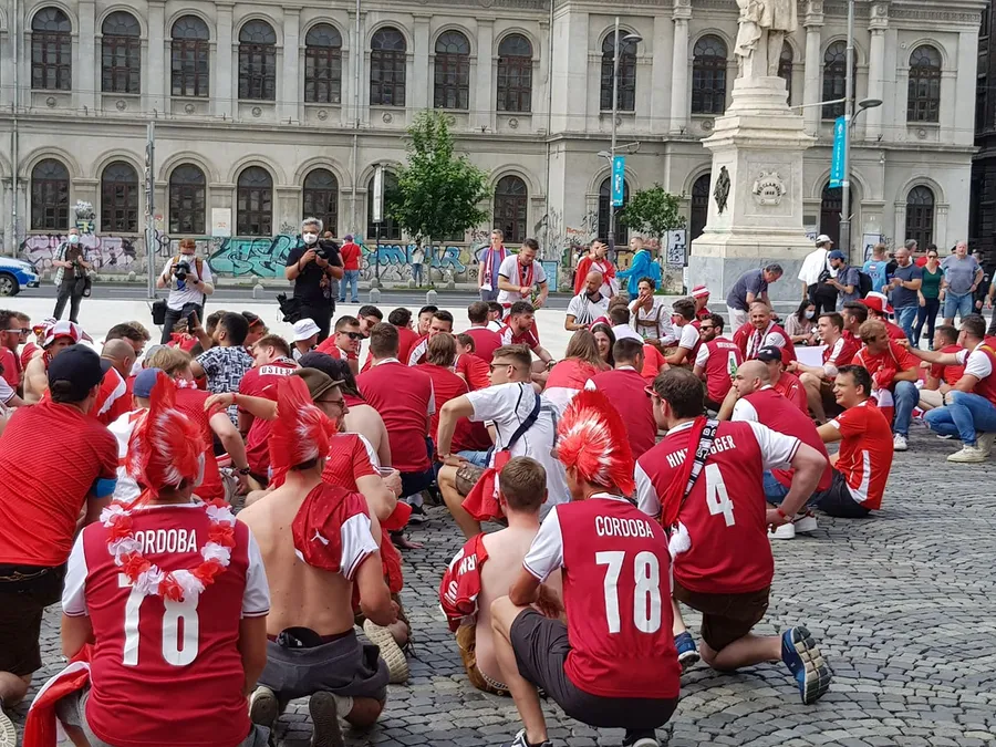 Cele două galerii s-au întrecut în cântece și în scandări. Suporterii Ucrainei au făcut spectacol în Centrul Vechi din Capitală, dar și austriecii s-au ridicat la înălțime.