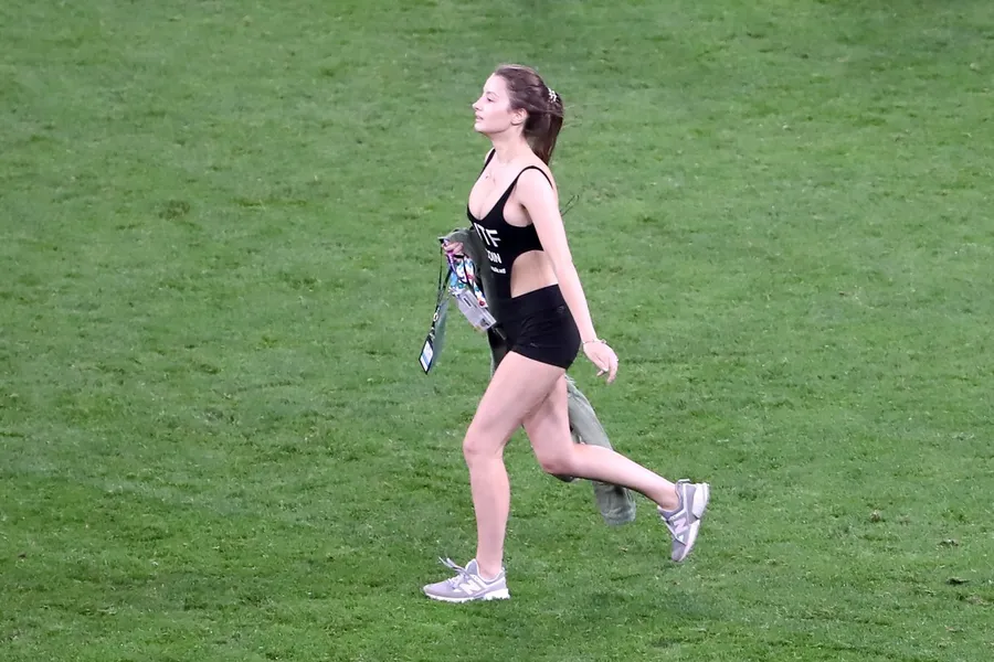 Stewarzii au intervenit imediat și au scos-o din teren pe cea care a fost aplaudată de toți spectatorii, mai ales că era îmbrăcată provocator.