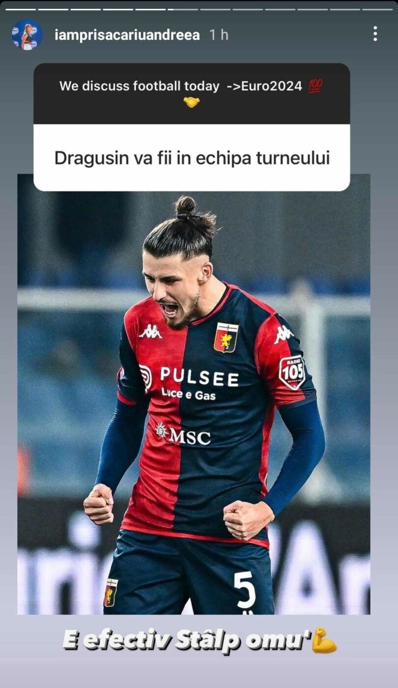 După partida de poveste a „tricolorilor” împotriva Ucrainei, Andreea Prisăcariu a avut cuvinte de laudă la adresa lui Radu Drăgușin. La comentariul unui urmăritor al Andreei Prisăcariu, care a menționat că fotbalistul va face parte din cel mai bun „11” al turneului, cea mai controversată jucătoare din tenis a fost de acord și l-a numit pe fotbalist „stâlp”, datorită preciziei cu care se apără.