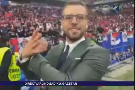 În timp ce meciul era în plină desfășurare, jurnalistul Arlind Sadiku, aflat în zona fanilor sârbi, i-a provocat pe ultrași în momentul în care, preț de câteva secunde, a imitat vulturul albanez cu mâinile.