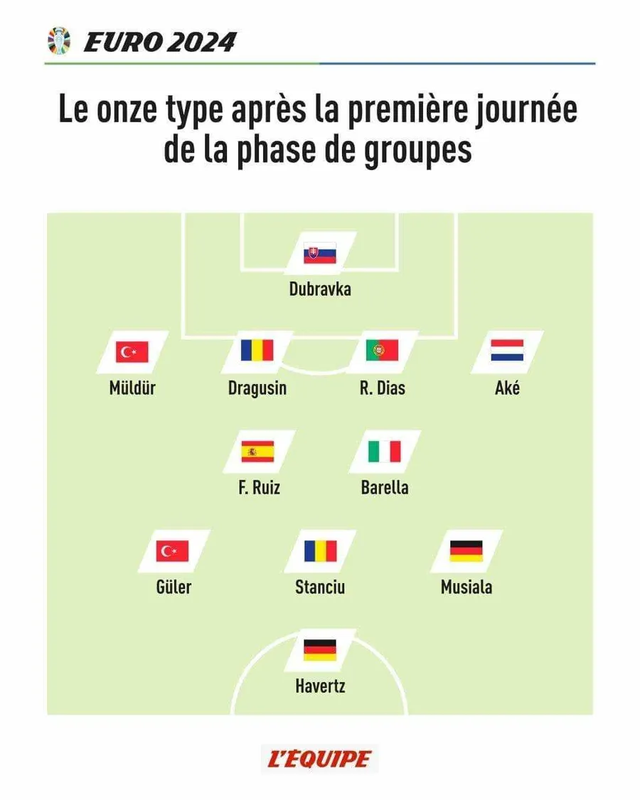 Echipa ideală a primei etape a fazei grupelor de la EURO 2024 în viziunea L’Equipe: Dubravka – Muldur, Drăgușin, Dias, Ake – Ruiz, Barella – Guler, Stanciu, Musiala – Havertz.