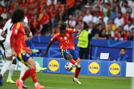 Lamine Yamal croșetează apărarea englezilor, îi pasează pe stânga lui Nico Williams, iar acesta șutează pe jos, la colțul lung.
