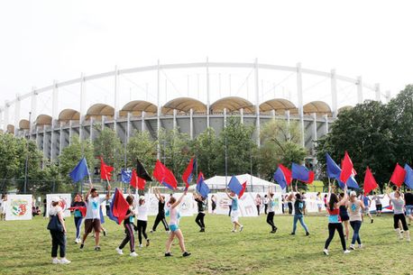 Locurile în care vor sta suporterii celor două echipe erau deja marcate prin pânze uriașe atârnate de pereții stadionului. Iarba din fața arenei, deși arsă pe porțiuni mari, era udată abundent. „Nu e recomandat să uzi gazonul ziua, dar asta e”, înțeapă un trecător. Pe un teren de lângă Național Arena, câteva sute de puști atrag ușor atenția. „Sunt 350 de oameni, repetă pentru ceremonia de deschidere”, explică un organizator. Apoi se repede la microfonul pe care îl ține strâns în mână: „Hai, mai avem o oră!”.