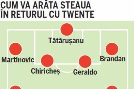 Astfel, antrenorii Stelei par deciși să schimbe, în primul rând, fundașul dreapta. Dănănae sare din schemă în urma prestației slabe din tur, în locul său urmând să intre Martinovic. Cerut de patron, Latovlevici va fi tot rezervă, Brandan fiind în acest moment alegerea pentru partea stângă a liniei defensive. Mai departe, Prepeliță va trece mijlocaș dreapta, iar în centru vor intra Bourceanu și Bicfalvi, ultimul cu o evoluție apreciată în meciul de la București. Dacă mijlocaș stânga va rămâne Tănase, în față se va renunța la Nikolic și va fi avansat Rusescu, alături de Leandro Tatu.
