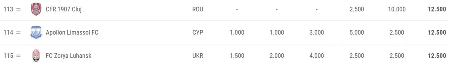 De menționat că ardelenii au același coeficient cu Zorya Luhansk (Ucraina), 12.500, însă în clasamentul UEFA sunt pe locul 113.