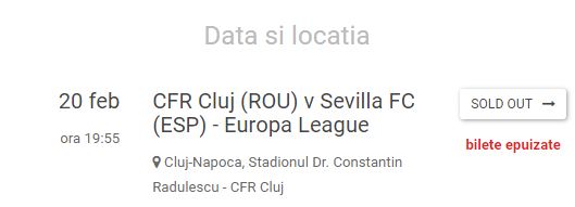 Returul dintre CFR Cluj și Sevilla se va juca joi, 27 februarie, de la ora 22:00, pe Stadionul „Ramon Sanchez Pizjuan”.