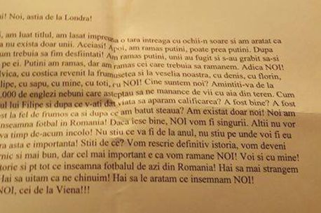 Am fost mulți, am luat titlul, am lăsat împreună o țară întreagă cu ochii-n soare și am arătat că în fotbalul ăsta nu există doar unii. Aceiași! Apoi, am rămas puțini, poate prea puțini. După unii, mulți, acum trebuia să fim desființați! Am rămas puțini, unii au fugit și s-au grăbit să își tragă plapuma pe ei. Puțini am rămas, dar am rămas cei care trebuia să rămânem. Adică noi! Cu Gerri, cu Silvică, cu Costică revenit la frumusețea și veselia noastră, cu Denis, cu Florin, cu Junior, cu Filipe, cu Săpu, cu mine, cu toți, cu noi! Cine suntem noi? Amintiți-vă de la Londra! De 80.000 de englezi nebuni care așteptau să ne mănânce de vii cu ăia din teren. Cum a fost după golul lui Filipe și după ce v-ați dat viața să apărăm calificarea? A fost bine? A fost frumos? N-a fost la fel de frumos ca și după ce am bătut Steaua? Am existat doar noi! Noi am fost tot ce mai înseamnă fotbal în România!