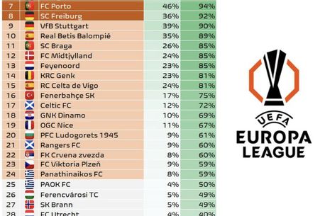 Din totalul de 36 de echipe angrenate în faza principală din Europa League, doar Maccabi Tel-Aviv este văzută cu șanse mai mici de a prinde o poziție în intervalul 9-24. Conform aceleiași surse, israelienii au șanse de 22% pentru a ajunge la play-off-ul pentru optimi și de doar 1% pentru a accede direct în optimi.