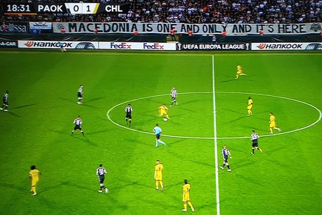 „Macedonia is one and only and it’s here”, au scris fanii lui PAOK de la tribuna a doua, mesajul fiind urmare a unui protest de lungă durată a grecilor din nord. Pe parcursul acestui an, sute de mii de greci au ieșit în stradă pentru a protesta față de folosirea numelui „Macedonia” de țara vecină Greciei, de Fosta Republică Iugoslavă Macedonia (FYROM). Potrivit Greciei, încercările FYROM de a adera la UE trebuie să fie blocate, elenii susținând faptul că țara vecină poate revendica, pe seama numelui, regiunea istorică de nord a Greciei. Exact zona în care se află Salonicul.