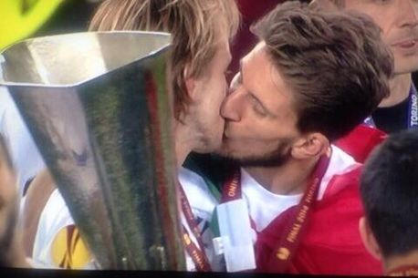 Un moment inedit a fost oferit de jucătorii Sevillei, Daniel Carrico și Ivan Rakitic (foto jos), care au fost surprinși de camerele de filmat sărutându-se în timpul ceremoniei de decernare a trofeului.