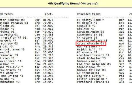 Astra nu este cap de serie, ceea înseamnă că poate întâlni echipe precum Șahtior, Olympiakos, Anderlecht, Fenerbahce sau West Ham. Până acum se știu posibili adversari din urna capilor de serie, care s-au calificat în play-off-ul Europa League. Este vorba despre echipele eliminate din turul III al Ligii Campionilor: Șahtior, Anderlecht, Olympiakos, Fenerbahce, Sparta Praga, PAOK, BATE. Celelalte echipe trecute în tabel joace în această seară și sunt favorite la calificare. În funcție de rezultate, urna capilor de serie poate suferi modificări.