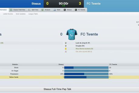 „Nilă” nu reușește mare lucru, iar cei care au înscris sunt tot olandezii, prin Douglas. Ne chinuim să vedem jocul din punctul de vedere al patronului stelist și îl băgăm pe Răduț, pentru că „ăsta se face jucător de milioane de euro”. Vârful batavilor, De Jong, mai punctează odată pe final și, cu acest rezultat, Football Manager 2012 ne confirmă faptul că nu poți fi antrenor „după ureche”, iar cel care stă pe banca tehnică trebuie lăsat să-și facă treaba. Nu de alta, dar diferențele între cele două jocuri sunt uriașe. Cifrele de la final ne pun pe gânduri și trebuie să fim mulțumiți că patronul încă nu a coborât pe banca tehnică. 23 de șuturi către poarta lui Tătărușanu, în timp ce Steaua nu l-a pus deloc în dificultate pe Mihailov.