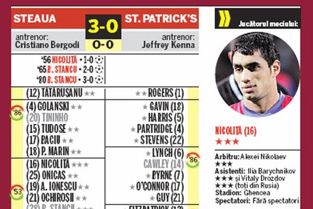 O întâmplare. La antrenamentul de miercuri seara, Bănel Nicoliță știa că este favorit la titularizare, dar avea o mină încruntată. În timpul exercițiilor tactice, fusese jucătorul către care s-au îndreptat cele mai multe critici ale lui Bergodi. Rata execuție după execuție, după care lovea nervos bara sau gardul de sârmă din spatele porții. Din tot acest amalgam de sentimente negative s-au născut un gol, o pasă de gol și un Bănel fericit.