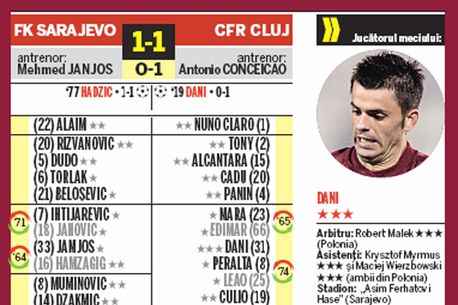 CFR nu și-a atins pe deplin scopul la Sarajevo, unde nu a izbutit decât o remiză, 1-1, care o face favorită pentru retur, dar nu sigură de calificare. După meci, clujenii și-au revărsat frustrarea pe arbitrul polonez.