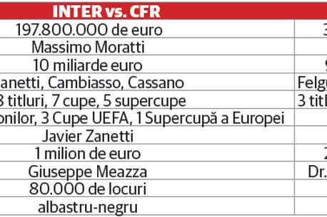 CFR Cluj se pregătește să dea piept joi seara, de la ora 22:05, în direct pe PRO TV, cu un colos al fotbalului european: Inter Milano. Clujenii vor avea în față unul dintre cei trei granzi ai Italiei, o grupare care are în lot jucători cotați la zeci de milioane de euro. În total, lotul lui Inter valorează 197.800.000 de euro, de peste cinci ori mai mult decât cota de piață a campioanei României, cifrată la 36.400.000 de euro.
