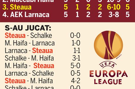 Tănase și compania nu mai au dreptul la încă un pas greșit. Pentru a se califica, Steaua e obligată să câștige cu AEK Larnaca și să spere că Maccabi nu ia trei puncte cu Schalke, echipă deja calificată. Pentru poziția a doua pot intra în cărți și ciprioții, dar doar cu o victorie în fața roș-albaștrilor.