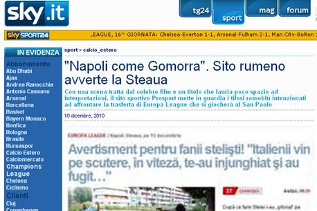 Ziarele italiene au preluat știrea publciată azi de ProSport în care fanii Stelei erau avertizați să nu meargă în deplasarea de la Napoli, jurnaliștii fiind șocați de faptul că românii se tem de incidente la ultimul meci din grupele Ligii Europa al "roș-albaștrilor". ANSA, cea mai importantă agenție de știri italiană, a fost cea care a preluat informațiile din ProSport -articol în care a fost dezvăluit, de către ofițerul de presă al celor de la Liverpool, felul în care sunt atacați fanii în
