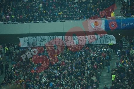 Dacă elevii lui Reghecampf au fost de nerecunoscut pe teren, părând niște fantome ale jucătorilor care impresionau în ultimele luni, fanii din tribune au fost admirabili. Pe lângă coregrafiile impresionante reușite de cele două peluze, suporterii au simțit că echipa pe care o susțin traversează momente grele și au cântat, chiar și la 0-4, ca în primul minut. Cei 50.000 de fani prezenți pe Național Arena au trăit unul dintre cele mai emoționante momente în debutul meciului, când la una dintre tribune a apărut un banner conținând un mesaj care nu mai are nevoie de niciun comentariu.