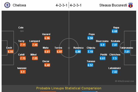 Din datele analizate de englezi, Steaua este inferioară lui Chelsea la toate capitolele, mai puțin media de vârstă și golurile, respectiv pasele de gol. Este normal însă ca realizările din timpul meciurilor să fie de partea Stelei, românii disputând 13 meciuri în Europa League, față de cele doar 3 ale londonezilor. Capitolul „tehnică” nu face deloc cinste steliștilor, englezii driblând în medie de două ori mai mult pe meci decât românii.