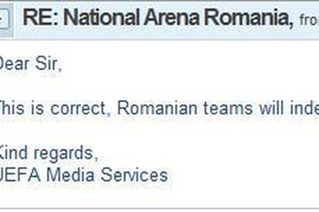 Diferendul dintre Steaua și FRF legat de disputarea meciurilor din primăvară pe Național Arena a fost clarificat ieri de UEFA. Forul european a răspuns printr-un mail la solicitarea ProSport și a specificat că roș-albaștrii pot juca în Europa pe acest stadion până cu zece zile înainte de finală.
