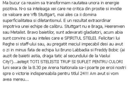 „Mă bucur că reușim să transformăm răutatea unora în energie pozitivă. N-o să înțleagă cei care ne critică din prostie și invidie ce valoare are VfB Stuttgart, mai ales că îi domină superficialitatea și diletantismul. E un rezultat extraordinar împotriva unei echipe de calibru. Stuttgart nu e Braga, Heerenven sau Metalist. Bravo băieților, sunt adevarați gladiatori, acum abia sunt convins că au înțeles care e SPIRITUL STELEI. Felicitări lui Reghe și staff-ului său, au pregătit meciul impecabil deși au avut o zi în minus față de echipa lui Bruno Labbadia și Freddy Bobic (ai auzit de băieții ăștia, dragă tătic al secundului de la Vaslui City?)…aștept TOȚI STELIȘTII TRUP ȘI SUFLET PENTRU CULORI luni seara de la 8.30 pe Arena Națională să-i poarte pe eroii noștri spre o victorie indispensabilă pentru titlul 24!!! Am avut și vom avea mereu…”, a scris un manager al Stelei pe Facebook.