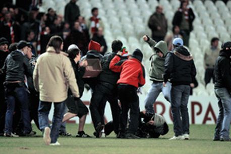 Meciul de joi seara, dintre Athletic Bilbao și Anderlecht, din „16"-imile Europa League, s-a terminat la egalitate, 1-1, însă suporterii celor două echipe au vrut să-și dispute supremația pe teren. Fanii au invadat gazonul și și-au împărțit pumni (foto), rănind și 12 oameni de ordine. Totul a început în timpul partidei, când suporterii belgieni au aruncat o torță pe gazon, enervându-i la culme pe spanioli, care au aruncat cu tot ce aveau la îndemână în fanii oaspeților. Scandalul a continuat după meci, când susținătorii celor două echipe au transformat terenul într-un ring de box. Președintele lui Bilbao consideră că belgienii sunt vinovați pentru încăierare. „Suporterii lui Anderlecht au fost văzuți în oraș: au băut toată ziua și nu s-au mai putut controla. Fanii noștri s-au apărat", a spus Garcia Macua.