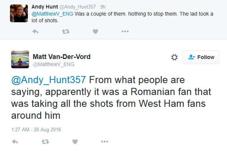 Fanii West Ham s-au plâns de lipsa de reacție a stewarzilor, însă se pare că la final spectatorii implicați în agresiune au fost reținuți de forțele de ordine.