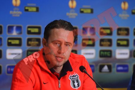 „Nu vă spun echipa așa cum nu am făcut-o niciodată. Lukasz Szukala va fi în teren sau nu, rămâne de văzut. El s-a antrenat normal. Florin Gardoș a făcut un meci bun în tur și consider ca la ora meciului să intre pe teren doar jucătorii care 100% pregătiți pentru această partidă. Indiferent de câți oameni vor veni la stadion, noi suntem fericiți că facem parte din această echipă și vom încerca să-i mulțumim pe cei care vor veni să vadă meciul. Ne dorim foarte mult ca mâine să sărbătorim calificarea alături de ei, dar nu va fi simplu. Nu jucăm singuri, vom întâlni o echipă foarte valoroasă. Terenul va fi așa cum va fi, dacă starea gazonului nu va fi cea mai bună nu este o problemă foarte mare. Trebuie să ne adaptăm rapid. Din păcate, în ultimele două meciuri jucate de noi în Europa League, noi am primit două cartonașe roșii. Trebuie să fim mai atenți, să avem grijă din acest punct de vedere”, a declarat Laurețiu Reghecampf la conferința de presă.
