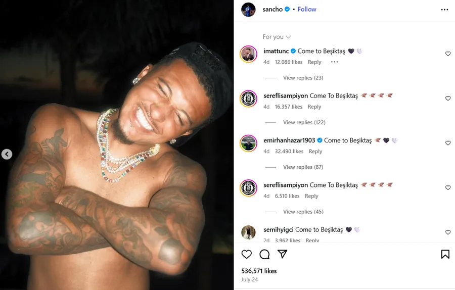 Postarea la care au comentat fanii lui Beșiktaș a ajuns să fie una din cele mai comentate postări din istoria Instagramului. Sunt șanse mari ca Sancho să părăsească echipa din Manchester în această vară deoarece nu intră în calculele lui Ruben Amorim. Totuși, Beșiktaș va avea o misiune dificilă să îl convingă deoarece pe urmele starului britanic mai sunt Juventus, Roma și Dortmund.