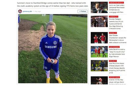 John Terry, 33 ani, și a început cariera tot la Chelsea, la 14 ani, și se poate lăuda cu peste 500 de meciuri jucate pentru formația londoneză, iar dintre cei doi gemeni pe care îi are fundașul englez, George și Summer, fiica sa este cea care îi calcă pe urme.