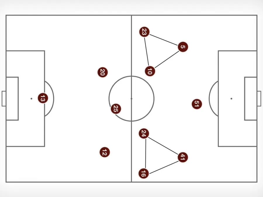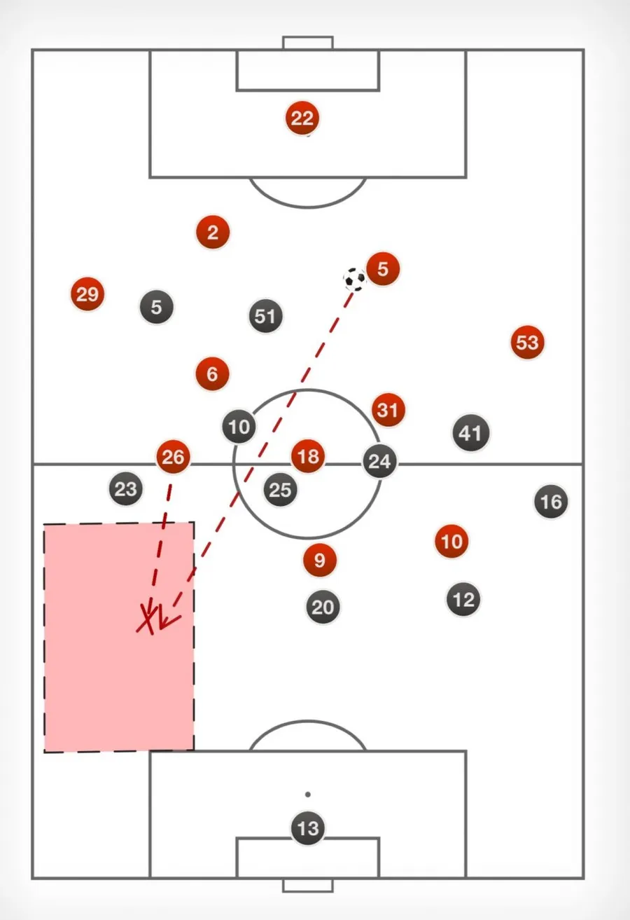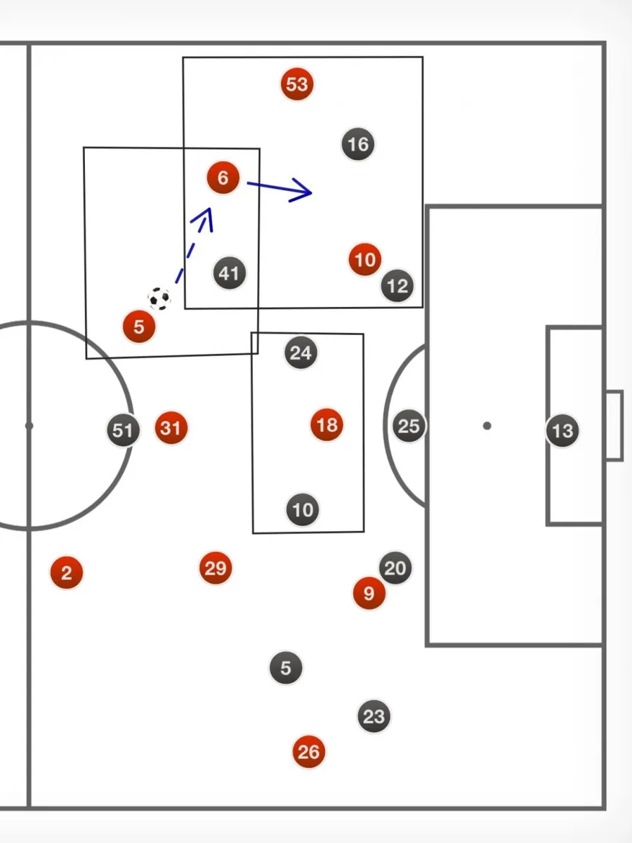 Fixarea fundașilor laterali adverși prin prezența lui Williams și Greenwood în benzi deschide spații de pătrundere pentru Rashford și Martial. Poziționarea coechipierilor este esențială pentru a restrânge mișcările adverse la mijlocul terenului. Wan Bissaka oferă opțiuni de pasă prin venirea în centru