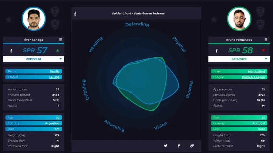 Din punct de vedere statistic Banega îl domină categoric la capitolul pase și dribling pe Bruno Fernandes, portughezul fiind superior ca viziune a jocului și pe zona de atac