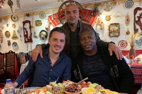Foto: Bogdan Apostu (stânga), Yakubu (dreapta), care are și el o școală de fotbal, e cooptat în priectul românilor, Gabriel Dumitru (sus). Yakubu Aiyegbeni a bifat 57 de meciuri pentru naționala Nigeriei și a marcat 21 de goluri.