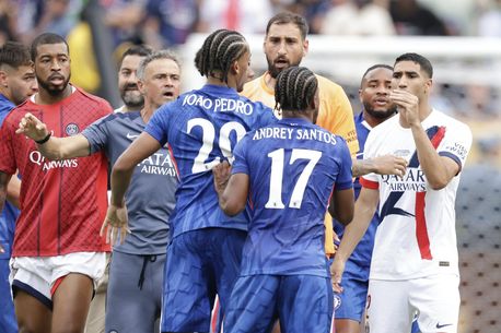 „Pe lângă eliminarea lui Joao Neves, care i-a tras de păr lui Cucurella, a izbucnit o busculadă după fluierul final, în care s-au implicat, printre alții, Donnarumma și Luis Enrique. Antrenorul parizienilor și-a pus mâna stângă pe fața atacantului lui Chelsea, Joao Pedro, care a căzut imediat. Spaniolul a trebuit să fie calmat de Presnel Kimpembe”, a scris RMC Sport.