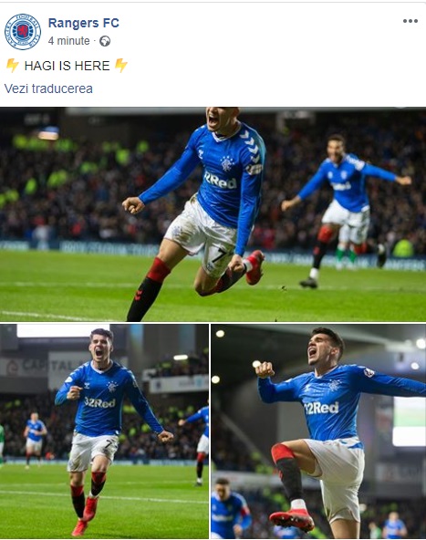 Ianis Hagi a înscris primul gol în tricoul lui Rangers. Românul a marcat în minutul 84 golul decisiv din partida cu Hibernian. „Hagi este aici” au scris scoțienii pe pagina oficială de Facebook a clubului de pe „Ibrox Park”, după această partidă.