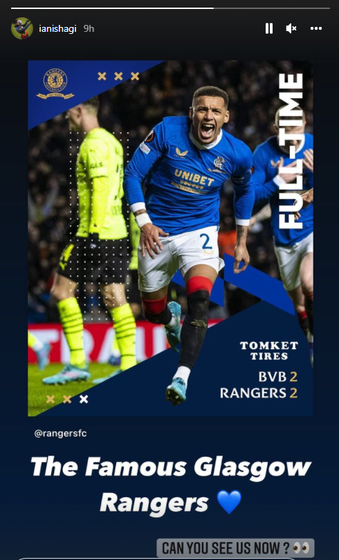 Mijlocașul român a postat un story pe contul de Instagram, cu rezultatul final al partidei de pe Ibrox. Alături de fotografie, Hagi Jr. a scris două mesaje: „Faimoasa Glasgow Rangers” şi „Acum ne vedeţi?”.