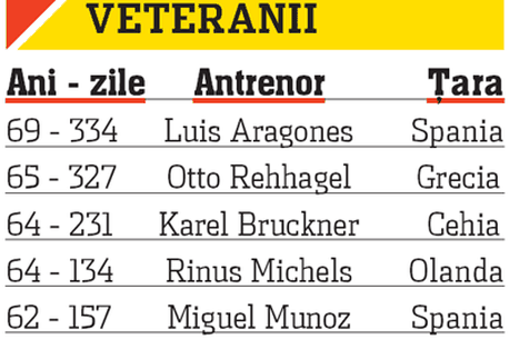 Luis Aragones (foto) bate record după record. Antrenorul care a reușit să ducă Spania în semifinalele unui turneu final de CE după o pauză de 24 de ani a devenit și cel mai vârstnic tehnician din istoria Europenelor care atinge această fază. Aragones l-a întrecut pe selecționerul Greciei, germanul Otto Rehhagel, cu patru ani. Spaniolul s-a născut pe 28 iulie 1938 și se ocupă de destinele naționalei iberice din 2004.