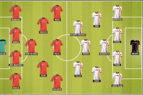 Naționala Spaniei ar juca în următoarea formulă: Casillas – Iraola, Javi Martinez, Ramos, Monreal – Silva, Xabi Alonso, Iniesta – Soldado, Villa, Mata.