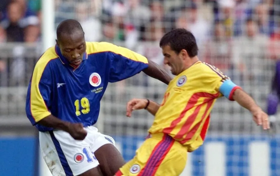 Colombian midfielder Freddy Rincon (L) duels with Romanian midfielder Gheorghe Hagi, 15 June during their group G World Cup match in Lyon, central France. Romania won 1-0. (ELECTRONIC IMAGE),Image: 68651772, License: Rights-managed, Restrictions: , Model Release: no, Credit line: Profimedia