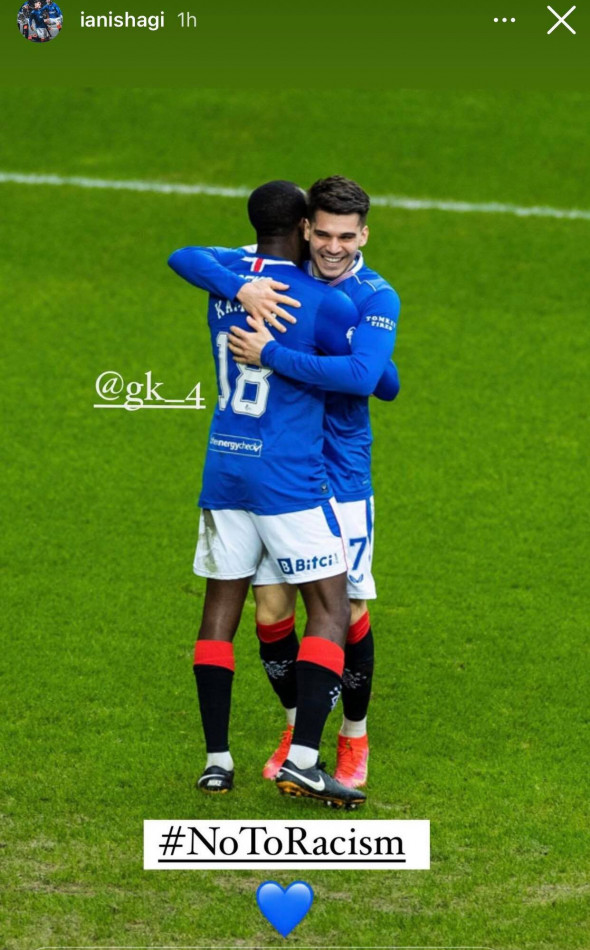 Ianis Hagi a postat pe Instagram o imagine în care îl îmbrățișa pe Glen Kamara, mijlocașul finlandez în vârstă de 25 de ani al lui Rangers, iar pe fotografie a adăugat mesajul „Nu Rasismului”.
