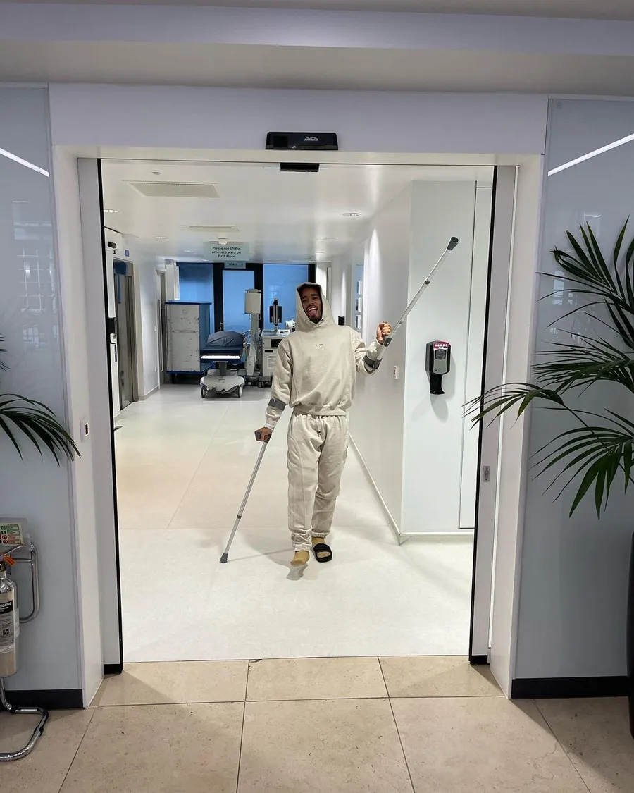 Vedeta lui Arsenal Londra Gabriel Jesus s-a pozat zâmbitor cu cârjele, după ce a fost operat cu succes la genunchiul drept, unde a suferit o accidentare gravă.