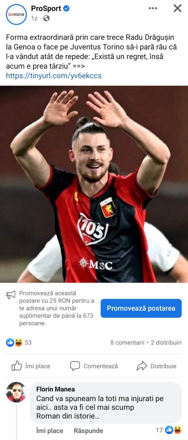 După ce jurnaliștii italieni de la SerieBnews.com au dezvăluit că există un regret în rândul oficialilor lui Juventus după ce l-au cedat pe Radu Drăgușin la Genoa, deoarece internaționalul român a explodat în tricoul grupării din Serie B, Florin Manea a reacționat pe pagina de Faceboook de la ProSport și a făcut un anunț important.