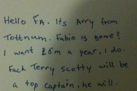 „Salutare, FA. Sunt Arry de la Tottenham. A plecat Fabio? Vreau 6 milioane de lire pe an. F*** Terry, Scotty va fi noul căpitan! Bun băiat Scotty este”.
