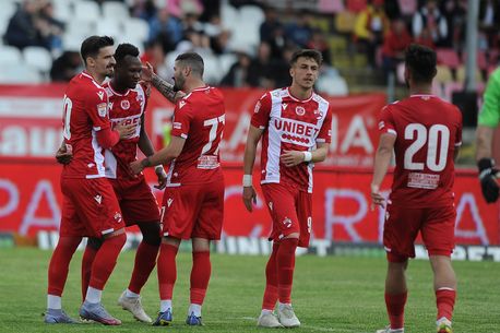Azankpo Desire Segbe se bucură împreună cu Geani Mihai Cretu, Alexandru Ilie Rauta și Steliano Filip la finalul meciului dintre Dinamo și Academica Clinceni.
