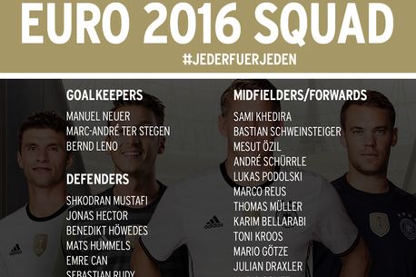 Dintre cei 27 de fotbaliști, selecționerul Germaniei, Joachim Löw, va renunța la 4 jucători, iar lista finală o va comunica pe 31 mai. Löw ar putea duce în Franța unul dintre loturile cu cea mai scăzută medie de vârstă. Julian Weigl, Julian Brandt și Leroy Sané au 20 de ani, iar Josua Kimmich are 21 de ani. În afară de GündoĂŸan, selecționerul Joachim Löw a renunțat și la Christoph Kramer, Matthias Ginter, Eric Durm, Roman Weidenfeller, Ron-Robert Zieler, Kevin Grosskreutz și Max Kruse.