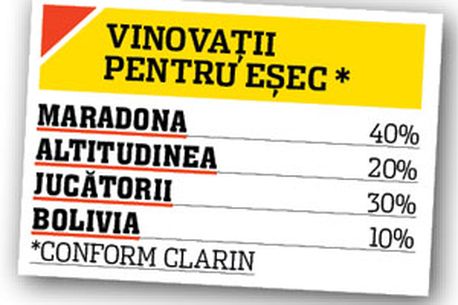 Beneficiind la maximum de altitudinea de 3.660 de metri la care a jucat la La Paz împotriva Argentinei, „Cenușăreasa” a zdrobit echipa lui Maradona cu 6-1 și a scris una dintre cele mai negre pagini din istoria naționalei „pumelor” după înfrângerea acestora din 1993, 0-5 cu Columbia. „Haos în defensivă, leșin în atac! Argentina a suferit o umilință istorică”, a titrat Clarin, chiar dacă Maradona, aflat la prima înfrângere ca selecționer al Argentinei, a dorit să contrazică această teorie: „Nu, altitudinea nu a influențat jocul. Fotbaliștii mei au evoluat atât cât le-a permis adversarul, care a fost mai bun. Punct”, a spus Diego după partidă. „Am suferit alături de jucători. Fiecare gol al Boliviei a fost ca o lovitură de pumnal în inimă”, a mai punctat Maradona. Astfel, data care trebuia să fie o zi festivă în Argentina, 2 aprilie reprezentând sărbătorirea veteranilor care au luptat cu britanicii pentru Insulele Malvine, s-a transformat într-o zi de tristețe. Principalul „vinovat” al înfrângerii argentinienilor, Joaquin Botero Vaca, autor a trei goluri, este un atacant de 31 de ani, cotat, conform transfermarkt.de, la doar 600.000 de euro. Concluzia au tras-o tot cei de la Clarin: „Inevitabil: fără erorile lui Diego și amnezia jucătorilor, Bolivia și înălțimea sigur nu ne puteau învinge”.