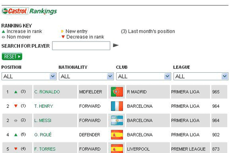 La câteva săptămâni după ce Messi a luat "tot", adică "Balonul de Aur" și "FIFA World Player", Ronaldo redevine numărul 1 mondial. Cel puțin din punct de vedere al cifrelor și statisticilor, reflectate de un studiu realizat de "Castrol". Portughezul e pe primul loc în clasamentul bazat pe un studiu impresionant, care ia în calcul performanțele de pe teren și care analizează un număr imens de variabile, studiate de un grup de analiști. Ronaldo a urcat de pe poziția a treia pe primul loc, detronându-l pe Henry (!), cel care era primul la finalul anului 2009. Lusitanul a acumulat 975 de puncte, față de cele 964 ale lui Henry și Messi, la egalitate pe poziția secundă. Pique (!) e pe locul 4, cu 905 puncte, iar Torres pe cinci, cu 873.