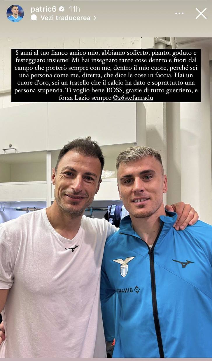 Opt ani alături de tine, prietenul meu, am suferit, am plâns, ne-am bucurat şi am celebrat împreună! M-ai învăţat multe lucruri, atât în teren cât şi în afara lui ce le port mereu în inimă. Ai o inimă de aur, eşti un frate pe care fotbalul mi l-a oferit dar mai presus de toate, o persoană fantastică. Te iubesc, Boss, mulţumesc pentru tot luptătorule, forza Lazio!”, a scris Patric Gabarron pe Instagram.