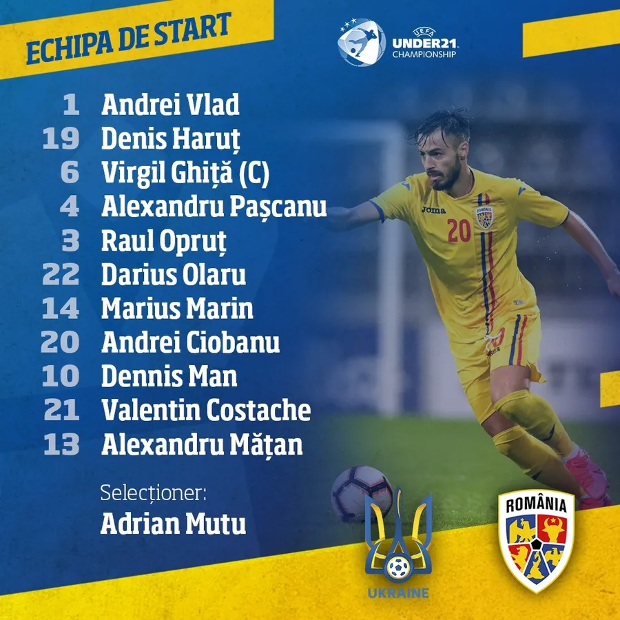 UPDATE 17:18: Echipa de start a României U21: 1. A. Vlad – 19. Haruț, 6. Ghiță (Cpt), 4. Pașcanu, 3. Opruț – 22. Olaru, 14. M. Marin, 20. Ciobanu – 10. Man, 21. Costache, 13. Mățan